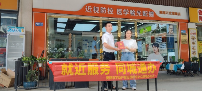 为彻底打通服务堵点,珠晖分中心主动突破传统服务等客上门的限制,精准锁定周边一公里核心区域,尤其在人流密集的“酃湖万达”商圈展开宣传攻势。工作人员深入社区、商户发放宣传单,现场讲解“同城通办”就近办理政策,并利用分中心紧邻酃湖万达金街的位置优势设立临时发证点,提供“咨询-受理-领证”一站式服务,直观引导业主体验“家门口登记”的高效与便捷。短期内为该处100余套房产高效办结登记手续,让业主们切实体验了“极速领证”的服务升级。
