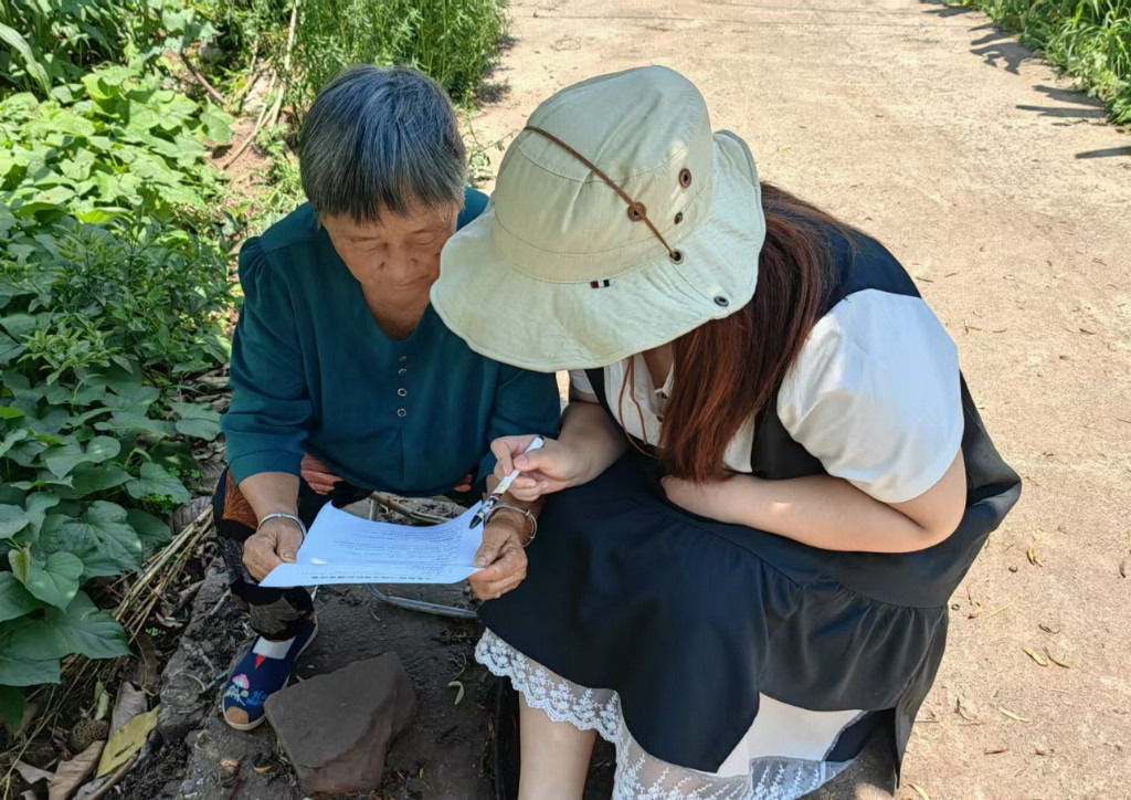 (图为吴林伶同学对农户进行问卷采访)
