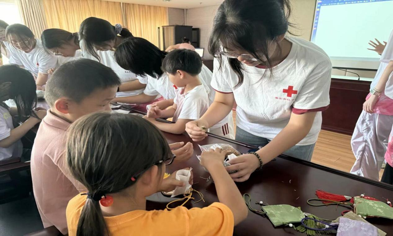 有了对药材的认识,小朋友们就可以根据自己的需求开始做香囊了。志愿者们提前准备了袋子、香囊等材料,耐心地帮助孩子一起填充药材、放入香包,系紧袋口。孩子们拿着香囊,在志愿者的手把手指导下,认真地完成属于自己的第一个香包。指尖翻飞间,一个个带着淡淡药香的小巧香包逐渐成型,孩子们举着自己的作品,脸上洋溢着自豪与喜悦。
