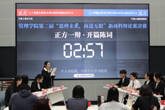 “社会对AI技术的价值认知与其实际能力相匹配,既未忽视其技术突破,也未脱离现实盲目神化。”,“体验感不是在直播间的情绪高亢,而是真实呈现在眼前的商品的可感、可触”……近日,浙江工商大学杭州商学院管理楼的教室内热闹非凡,原来是该校正在开展第二届“思辨未来,商道无限”新商科智慧辩论赛,此次辩论赛吸引了学院众多学子与教职工的关注。