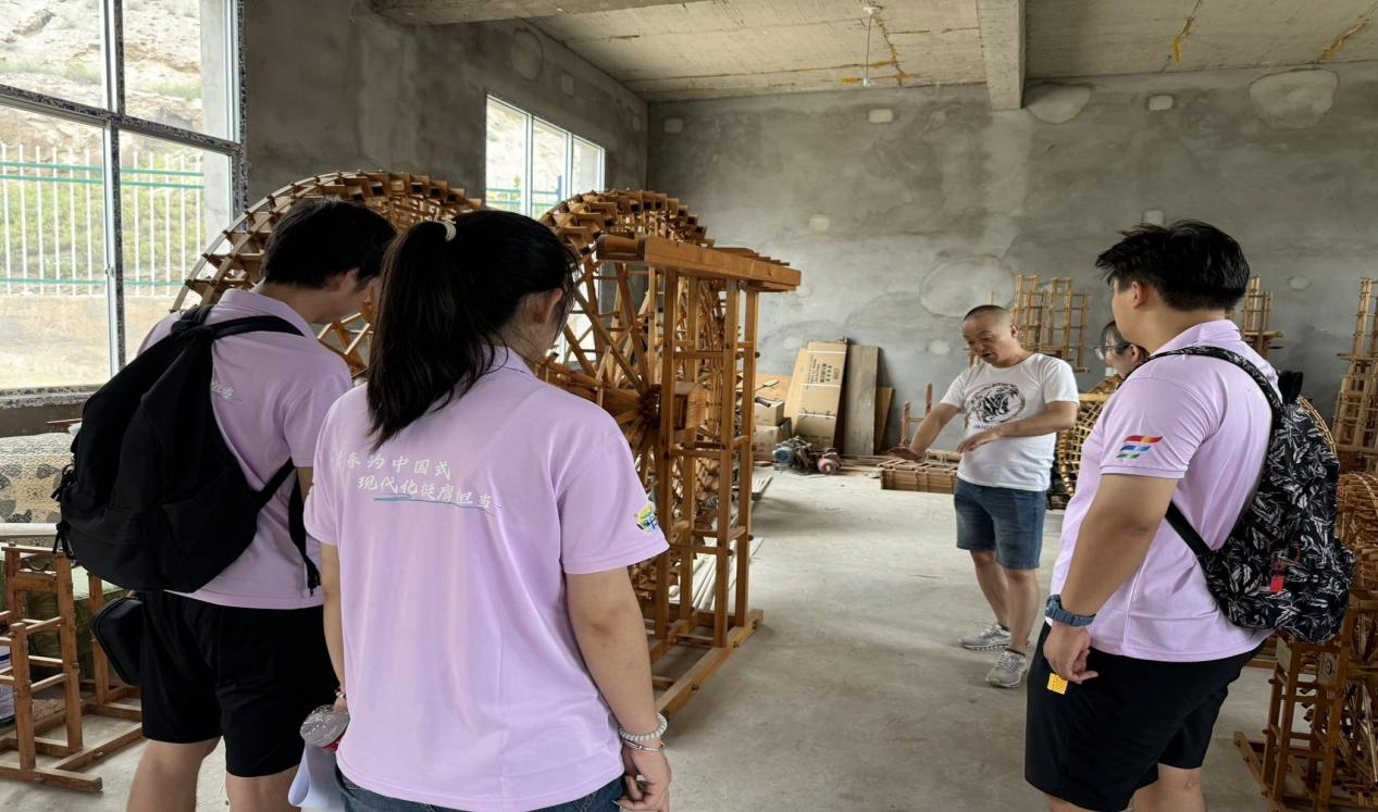 匠心对话,传承文化基因,激活创新动能。实践的核心环节是与非遗传承人的深度对话。7月20日,实践队师生怀着敬意专程拜访了国家级非物质文化遗产项目“黄河水车制作技艺”代表性传承人段祖宏先生。段祖宏先生不仅现场展示了精湛的水车模型制作工艺,更深情讲述了其家族四代人跨越百年,矢志不渝守护黄河水车技艺的感人历程。“水车是兰州的魂,是黄河赐予我们的智慧结晶。每一根木料的选择,每一道榫卯的契合,都凝聚着先人对自然的敬畏和生活的智慧。”段祖宏先生质朴而深情的话语,让同学们深刻领悟到非遗所承载的厚重历史、卓越智慧与深沉的家国情怀,认识到保护传承非遗对于守护文化根脉、坚定文化自信的时代价值。队员们不仅认真聆听,更积极投入实践,在段老师指导下参与了水车构件的实地测绘工作,亲手触摸、测量、记录,真切感受传统技艺的精妙绝伦与匠心独运。基于对传承使命的共同认知,实践队与段祖宏老师现场达成了合作意向:未来将充分发挥明德青年优势, 运用短视频、直播等新媒体手段记录和传播水车技艺,并共同探索开发兼具文化内涵与市场吸引力的黄河水车主题文创产品,以创新方式拓宽非遗传播渠道,增强其生命力。