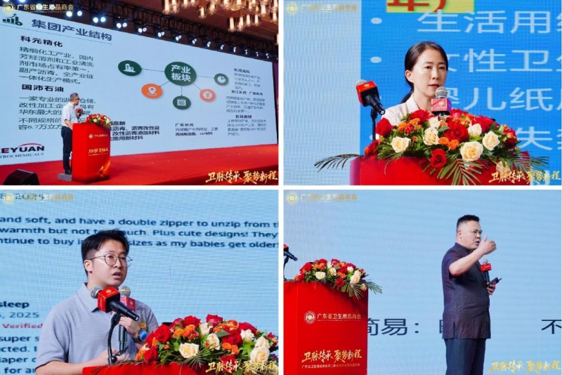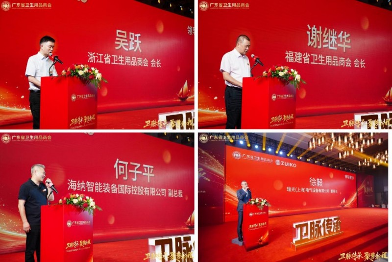 浙江省卫生用品商会会长吴跃、福建省卫生用品商会会长谢继华分别致辞,热烈祝贺大会圆满成功,并冀望浙闽粤三省企业深化协同,携手共筑卫品产业生态圈。瑞光(上海)电气设备有限公司董事长徐毅上台致辞表示,瑞光将持续投入研发,在节能设备、数字化管理系统等领域与商会企业深度联动,共同推动行业发展。海纳智能装备国际控股有限公司副总裁何子平上台致辞,作为深耕卫品装备领域的企业,海纳智能始终将 “赋能产业升级” 作为核心使命。