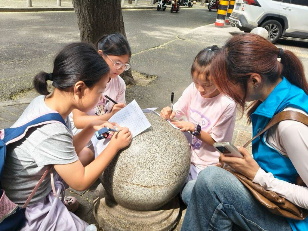 图为团队成员向小朋友和家长讲解问卷内容。简云涵 供图