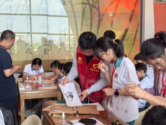 在面向青少年的研学课堂上,实践队员们分工协作,成为讲解人员的“得力助手”。课前,队员们提前到场,将教具按课程进度分类摆放,对手工材料进行分装,确保道具整洁有序。课堂中,队员们穿梭于孩子们之间,用趣味问题引导思考,配合讲师完成知识点的互动教学。手工实践环节里,队员们化身“技艺辅导员”,针对年龄较小的孩子手把手教学——在“北朝墓志与拓片制作”课程上,队员们协助讲师,教手法生疏的孩子们将宣纸平整覆于墨盘之上,耐心指导捶拓力度“屋檐上的艺术北朝瓦当”活动中,队员们指导孩子们复刻瓦当,讲解纹饰中蕴含的祈福寓意。当有小朋友因步骤复杂产生畏难情绪时,队员们便鼓励坚持,让孩子们在成就感中理解“工匠精神”的内涵。课堂结束后,队员们逐一回收道具、整理场地,用细致工作保障后续活动顺利开展。
