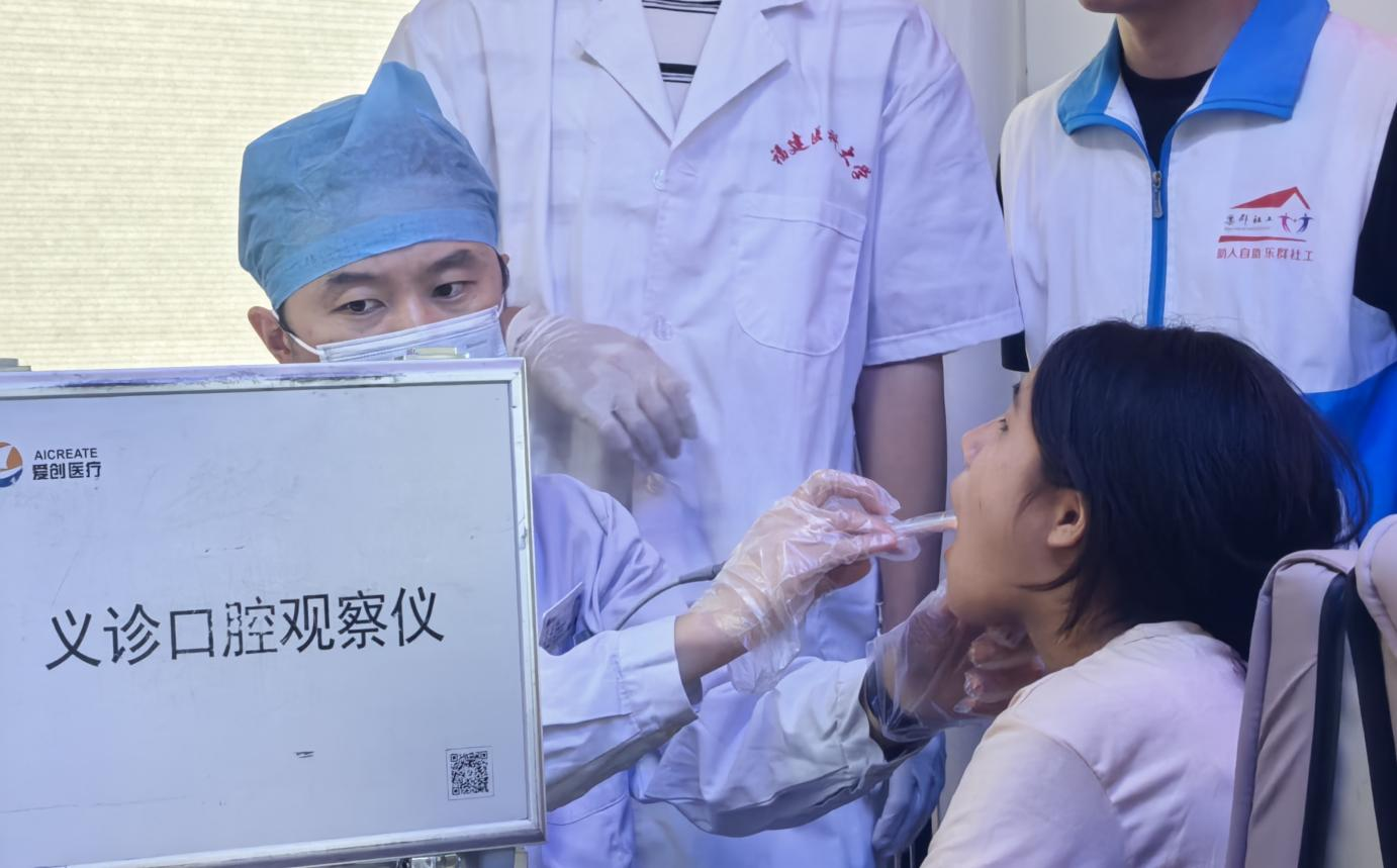 课堂结束后,义诊活动开始。带队老师陈帅逐一为学生进行口腔检查,针对色素沉淀、乳牙松动等问题提供个性化护理建议;实践队同时使用AI口腔检测仪,通过高清成像与系统分析生成检测报告,让健康评估更具科学性,受到学生与家长的一致认可。