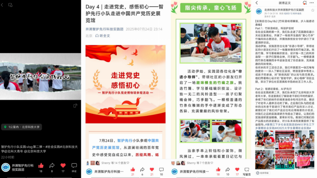 井溯智护先行科技实践团创新打造"1+N"新媒体传播体系,构建起立体化、多维度的宣传网络:以微信公众号为核心阵地,小红书、抖音、微博、B站等平台同时运营。