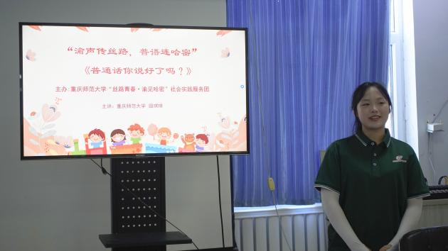团队首站走进海子沿乡尖山子村红领巾小课堂。首先,团队成员田琪琦主持推普活动,她从重庆火锅等特色切入,结合方言与普通话的差异进行导入,引发孩子们的好奇心。随后进行语句断句练习,选用几个多音字句子考察孩子们的普通话掌握情况;组织诗歌朗诵活动,带领孩子们共读经典篇目。课堂上,孩子们纷纷高举起小手参与问答。孩子们全程双眼紧盯着讲台,主动跟随引导大声朗读、积极互动,这一环节通过多样形式让孩子们在欢乐中提升语言能力,更拉近了不同地域文化间的距离。