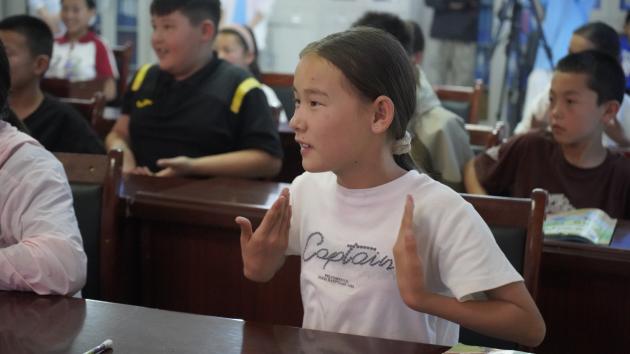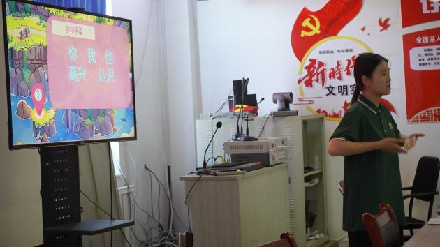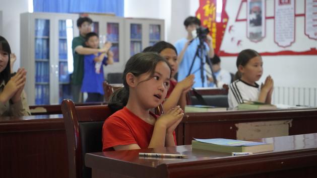 在手语科普环节,由团队成员施译承担教学任务。她首先讲解对听障人士的正确称呼,引导孩子们树立平等对待听障群体的意识。随后,正式教学以“手语闯关”的游戏形式推进,她教导孩子们学会了多个手语表达,如“新疆”“重庆”“爱”。孩子们认真跟做每一个手势,施译也对细节动作进行一一纠正。手语科普这一特殊环节让孩子们在趣味互动中掌握了基础手语表达,更在实践中培育了尊重差异、关爱他人的文明素养,为构建包容社会埋下种子。