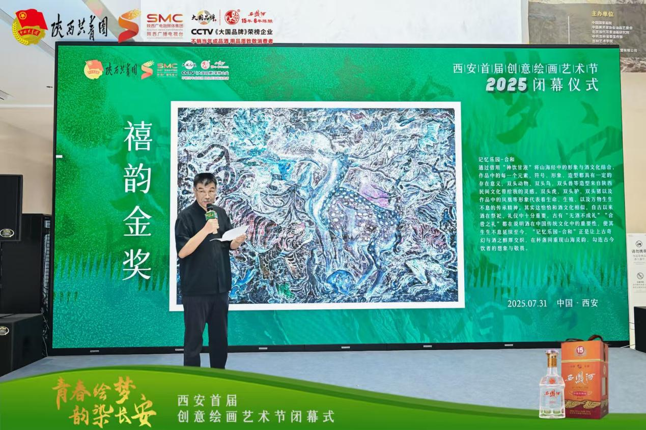 颁奖环节成为全场焦点。入围奖 90 名、祥韵铜奖 6 名、福韵银奖 3 名、禧韵金奖 1 名。西安美术学院跨媒体艺术系教授邢戈对一等奖作品的专业点评,从艺术构思、表现手法等维度深入剖析,为创作者与现场观众带来专业艺术解读,让活动兼具颁奖仪式感与艺术研讨氛围。
