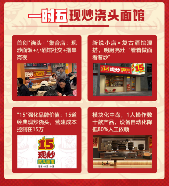 这场品类革命的核心在于价值重构。"一时五"巧妙定位在快餐与正餐之间的黄金地带,用现炒的锅气满足消费者对"真实烹饪"的渴望,用精心设计的就餐环境提供超越快餐的体验感。菜单上15款经典现炒浇头构成核心竞争力,搭配特色小吃和中式糖水,既解决单人用餐需求,又创造社交分享场景。更关键的是引入"浇头+"概念,白天是高效面馆,夜晚变身小酒馆,全时段经营模式让坪效达到传统面馆的2.3倍,完美化解商场高租金的压力。
