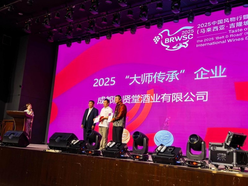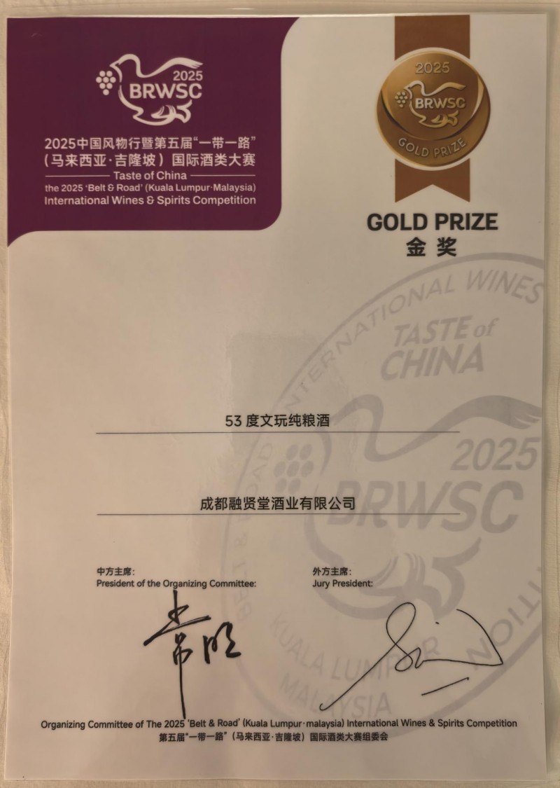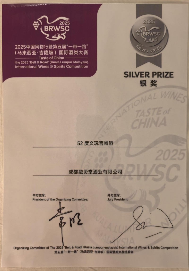 【吉隆坡讯】2025年7月30日,在马来西亚吉隆坡国家会议中心举行的第五届"一带一路"国际酒类大赛颁奖典礼上,成都融贤堂酒业有限公司选送的两款产品从全球121家企业320款参赛酒品中脱颖而出——"文玩纯粮酒"荣膺金奖,"文玩官帽酒"喜获银奖,成为本届大赛同时斩获两项顶级奖项,并评选为“大师传承”称号的中国酒企。