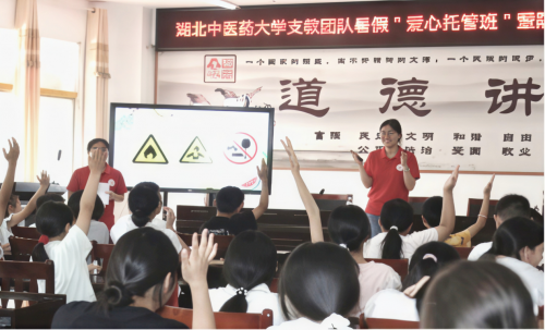 7月7日,郧西县安家乡九年一贯制学校的防溺水宣誓声响彻校园。湖北中医药大学管理学院同心圆志愿者团队创新融合中医“治未病”思想与安全教育,通过场景化教学筑牢乡村儿童安全防线。在“岐黄安康”课堂上,学生庄严宣誓“防溺水六不准”并参与情景模拟演练。