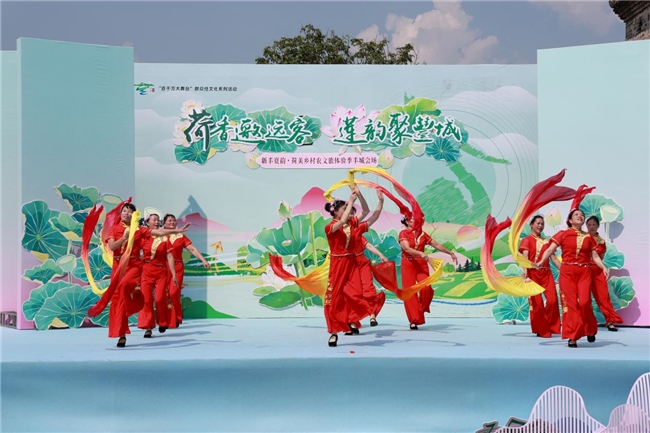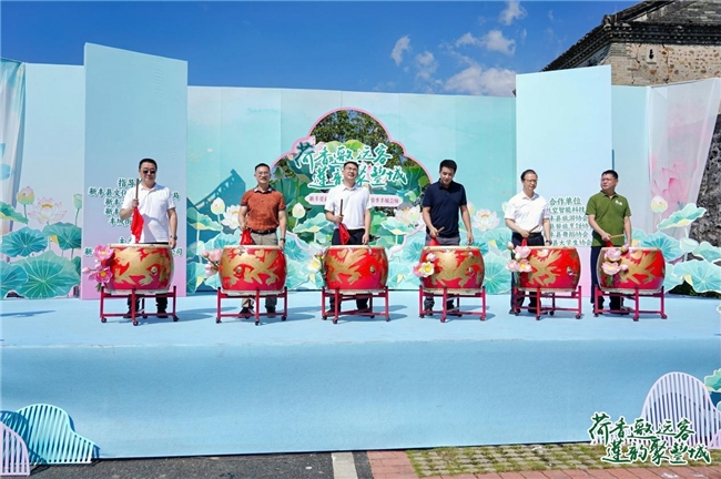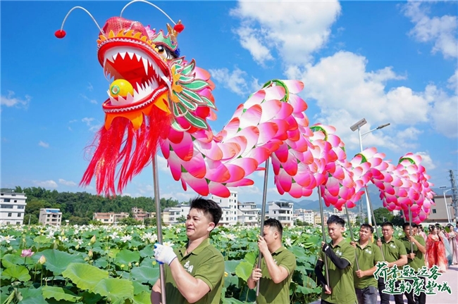 26日,开幕式上歌舞翩跹、龙腾荷涌,吸引众多游客共赴盛景,而后与会领导嘉宾敲响三声擂鼓,寓意着“龙腾龙围、福泽丰城”的“荷花龙”腾跃而出、绕村巡游,标志着新丰夏韵·荷美乡村农文旅体验季丰城会场活动正式开始。