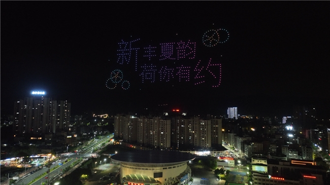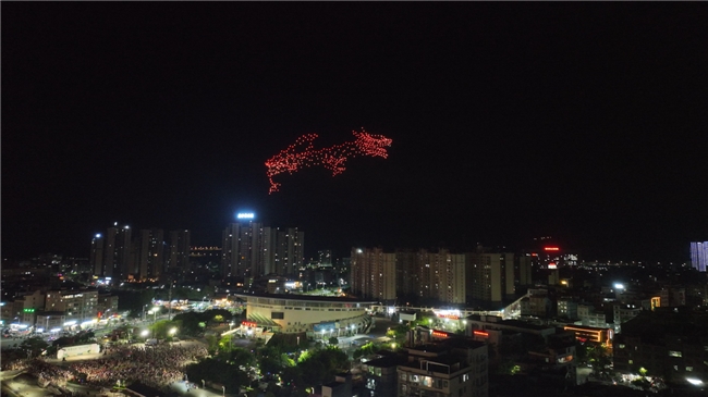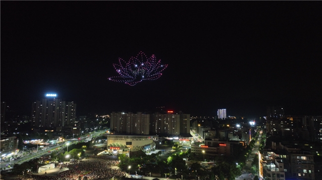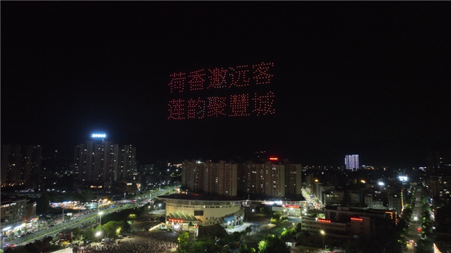 25日晚,新丰县文体广场500架无人机腾空而起,墨色天幕中主题文字“新丰夏韵 荷你有约”率先亮相,随后无人机绘制的游龙、荷花、镇江楼、佛手瓜等图案闪耀星空,鲤鱼舞、担丁酒、“福”字张田饼印等非遗项目图案生动还原,继而变换组合为“好运莲莲 一路生花”“中国岭南避暑胜地”“得闲来新丰 清凉一夏”,璀璨星河与荷塘月色交相辉映,科技之美与自然之韵完美融合,为居民群众、游客朋友呈现一场无与伦比的视觉奇观。