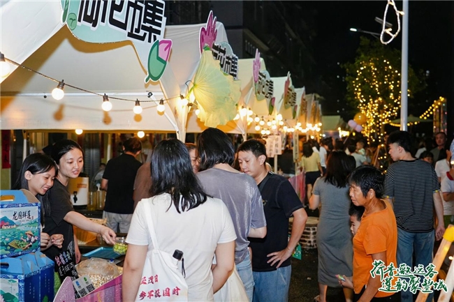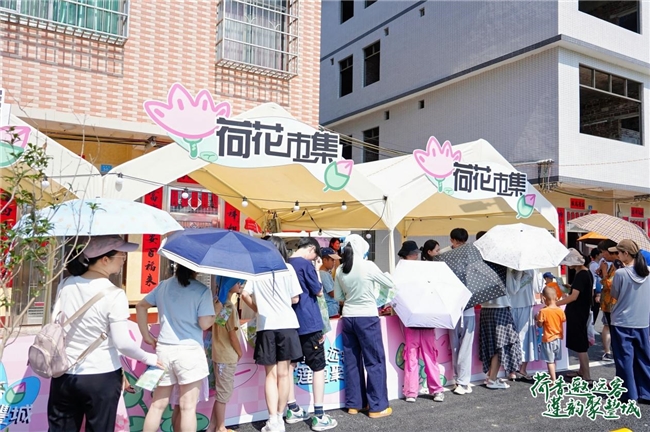 “荷美”市集上,地道小吃香气四溢,软糯清甜的荷花糕、清凉解暑的荷花雪糕、清甜滋润的莲子羹为游客送上丝丝清凉滋润;文创产品琳琅满目,荷叶扇、荷花灯、荷花手提袋农特产品备受青睐,饱满新鲜的莲子、清凉解暑的荷叶茶、脆嫩爽口的新丰佛手瓜纷纷吸引游客驻足品尝。