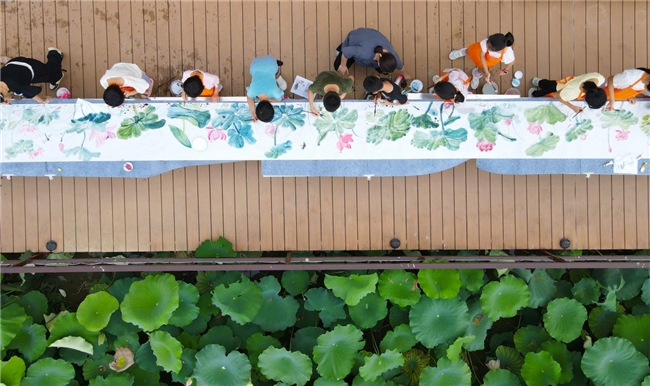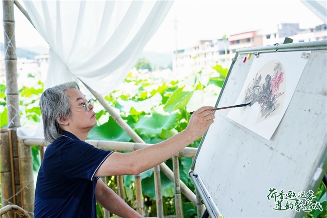 荷塘畔实景写生区里,中国画院院士段大刚先生正对着盛放的荷花挥毫泼墨,还有稚童相伴两侧,这一幅“名师与总角”的生动画面,笔墨间尽显乡村诗意,旁边还设置了10米荷花长卷展览,展示着青少年们以“荷”为题的创意画作,吸引了不少游客驻足欣赏。
