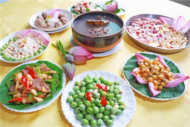 活动期间,在龙围村内经营的农庄,将龙围村520亩的荷塘内,粉白相间、摇曳生姿的荷花与美食创意融合,各展神通推出特色一桌“荷花宴”,荷花花瓣、荷叶、莲子、莲蓬经过厨师的巧手烹饪,莲蓬莲子汤、油炸荷花瓣、莲藕酿、荷叶蒸鸡、素炒莲子……多重口味一应俱全,将“鲜莲一身都是宝”的特点发挥出来,为游客带来视觉享受的同时,更能感受味觉冲击,一桌"荷花宴"成为了游客朋友用餐的首选焦点。
