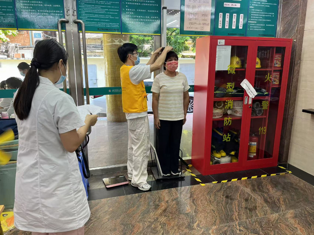 图为队员帮助老人测量身高。李汉荣供图