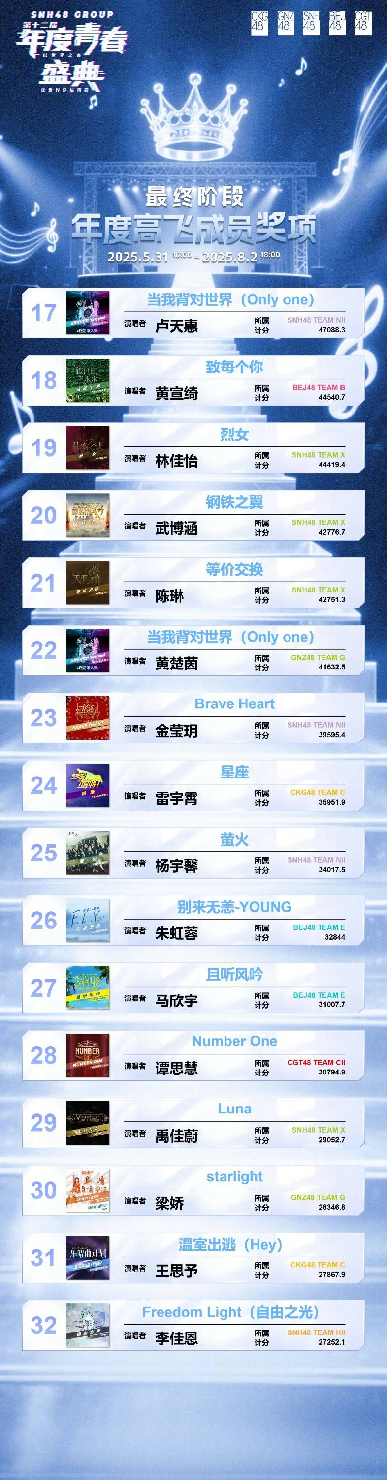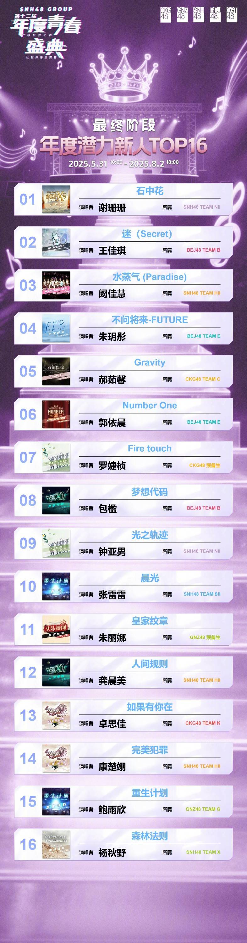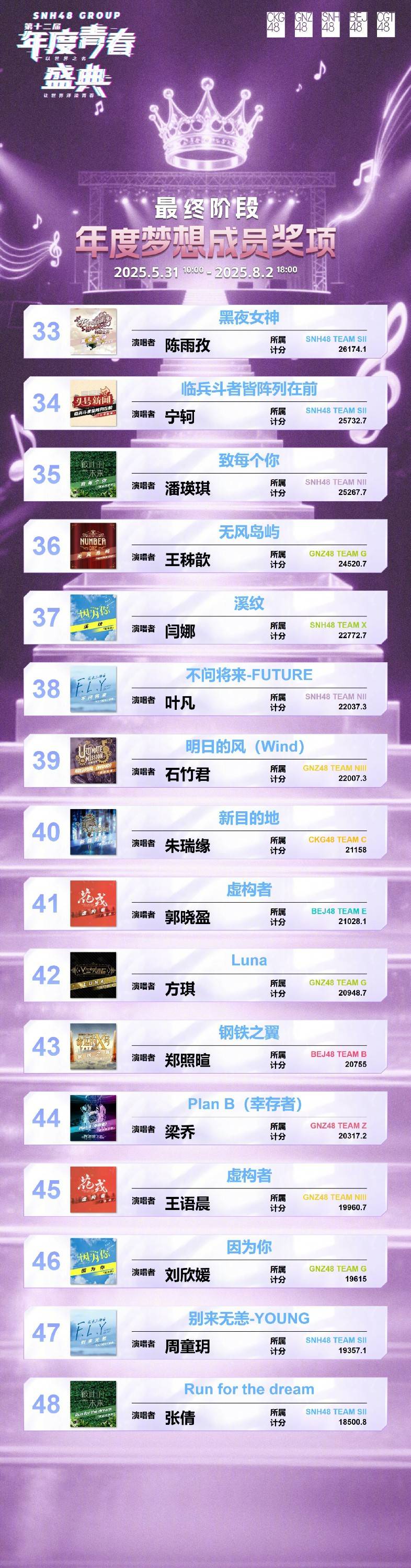 本年度青春盛典最终收获人气奖项的48首优秀作品中,SNH48占据26席,GNZ48 占据12席,BEJ48 占据6席 ,CKG48 占据3席,CGT48 占据1席。在今夜之后,新世界的大门打开,全新秩序重启,SNH48 GROUP当不畏艰难险阻,以“梦想、汗水、坚持”为座右铭,继续向着巅峰进发。