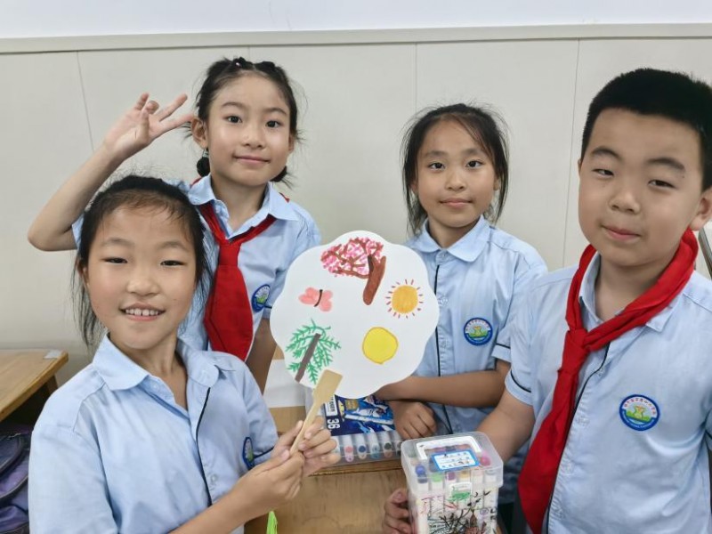 课堂高潮处,徐佳舟带领孩子们动手制作端午安康符——彩纸折叠、丝线缠绕、提笔写字,小小的纸片在孩子们手中变成承载祝福的信物。“老师,我要把这个符送给奶奶,祝她身体健康!”一位同学举着作品雀跃地说。随后的漆扇绘制环节更添韵味,从线条勾勒到色彩晕染,孩子们将对传统文化的理解融入画笔,一把把独一无二的漆扇上,既有稚嫩的牡丹图案,也有歪扭的“平安”二字,让传统美学在童真创意中焕发新生。