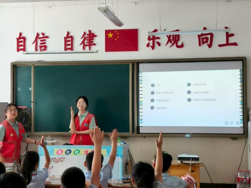 作为实践活动的首站,泰山小学的教室里早早洋溢着欢声笑语。志愿者徐佳舟带来的传统文化课,成为孩子们最期待的“文化盛宴”。她以传统节日为切入点,从春节的团圆寓意讲到端午的爱国情怀,将屈原投江的悲壮故事与包粽子、挂艾草的民俗习俗娓娓道来。“谁知道端午节为什么要系五彩绳呀?”徐佳舟的提问刚落,孩子们便争相举手,分享着家乡的过节习俗。