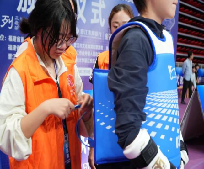 作为电子护具检查员的陈同学如同隐形的守护者,用细致为赛事公平保驾护航。她提及到当遇到损坏的头盔和护具时,她迅速联系工作人员及时完成备用护具的调换以确保赛事的“零误差”,即使身处幕后也同样感受着体育的热血。
