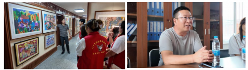 下午,在靖宇县农民画研究会党支部,县美术家协会主席马全富的讲解更是让我们受益匪浅。马全富老师倾情讲述农民画里流淌的乡愁与坚韧,每一幅农民画都色彩鲜艳、充满生活气息。通过与马主席长达一小时的访谈,我们深入了解了农民画的传承历程,了解到了靖宇农民画具有长白山地域特色和关东文化深邃内涵,题材来源于生活,又高于生活,色彩艳丽且对比强烈,雅俗共赏,具有传统年画浓厚的喜庆气氛,把生产、生活与表达情感紧密地联系在一起,使作品精神再次升华,博得了大众的普遍喜爱。我们明白了非遗不仅仅是技艺的传承,更是情感的寄托,是家国情怀的生动表达。
