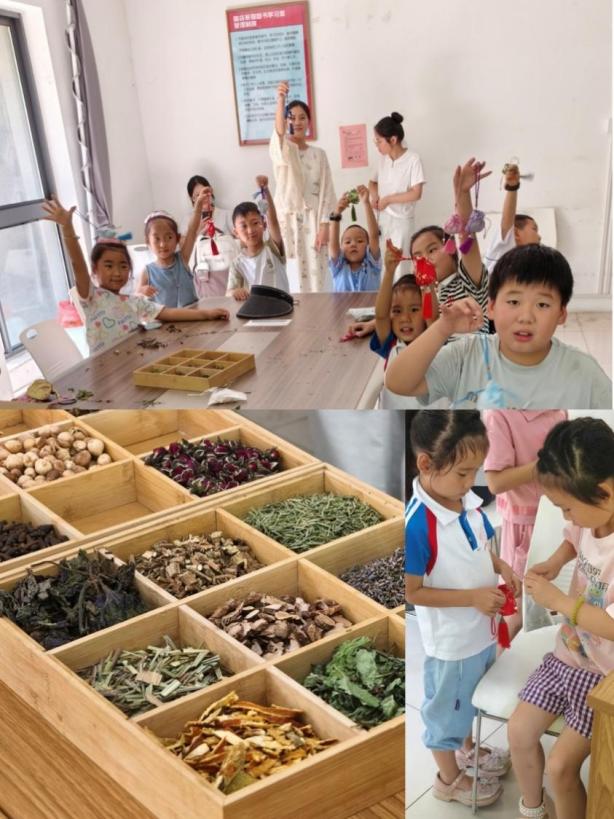 图为:孩子们巧手制作香囊,药香四溢
