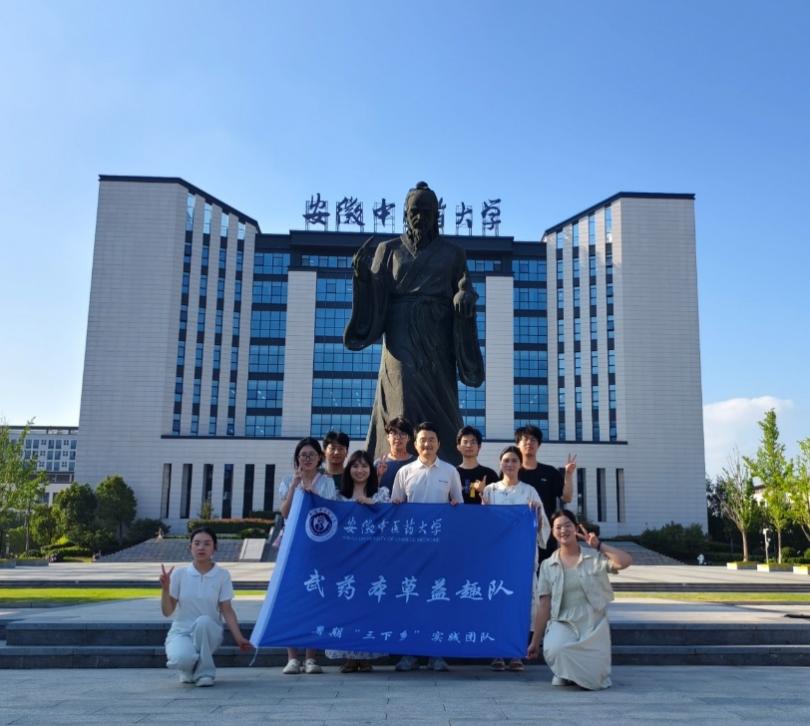 图为:“武药本草益趣队”于学校华佗像前整装待发