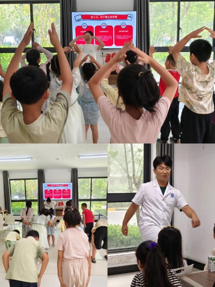 “跟我学‘熊晃’,模仿熊的沉稳,调理脾胃……”队员们化身导引师,带领居民尤其孩子们习练五禽戏与八段锦。一位小学员练得格外认真:“动作看着慢,学起来不难,练完浑身是劲!”队员们将复杂功法拆解为“虎扑强筋骨”、“双手托天理三焦”等核心动作,并编顺口溜:“八段锦,不复杂,抬手举足调心肝;五禽戏,仿生灵,练罢通体皆舒畅。”古老养生功法融入全民健身,成为社区健康新风景。