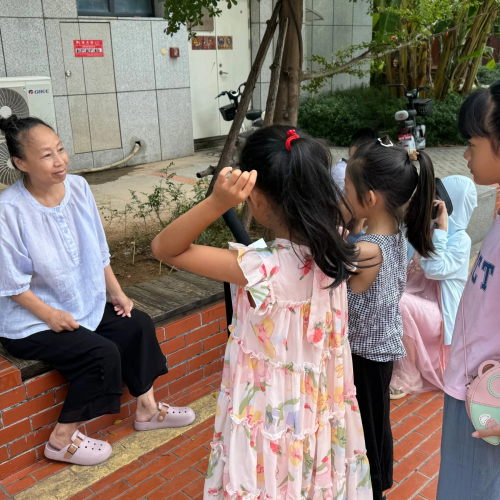 7月13日上午的“小小采访员训练营”中,23级会计与金融学院学生李佳璇通过情景短剧,演示“如何礼貌和正确提问”,教导孩子们开放式提问技巧与倾听礼仪。随后,志愿者将小朋友们分成了3支小队,分别前往社区中心寻找当地居民进行实地采访。在正式出发前,小朋友们集体宣读了《采访小倡议》——“尊重被采访者,认真记录每一个故事。”童声稚嫩,宣誓却铿锵有力。每一组小朋友在小老师的引导下都明确了分工,顺利完成了采访,将课堂所学灵活运用到了实践当中。