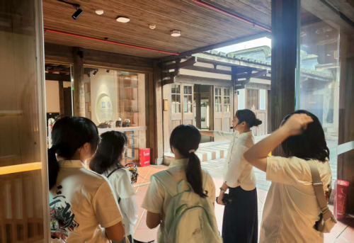 细雨浸润下的古厝更显韵味。队员们踏上被雨水冲刷得发亮的青石板,在天井回廊间穿行。有人驻足细观红砖墙上镶嵌的南洋贝壳装饰,有人抬头仰望“燕尾脊”上的精巧石雕,还有人轻推吱呀作响的木门,切身感受历史的厚重。在“四水归堂”的天井下,大家凝神观察,深刻体会着古建筑的布局智慧与岁月沉淀的韵味。