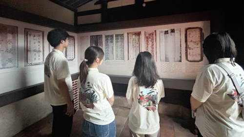 7月12日,古厝薪火实践队前往福州梁厝进行调研,队员们紧随讲解员的步伐进入展厅参观,真切体会到“听一席话,穿千年烟云”的内涵。讲解员对家谱的解读,瞬间激活了沉睡的“厝”魂,“商行四海”的帆影仿佛在眼前鼓荡,“敦亲睦邻”的温情如暖流浸润心田。这其中蕴含着“耕读传家”的坚守、“敢拼会赢”的胆魄,更是闽都文化最深沉有力的脉动。队员们屏息凝神,在他们眼中,“厝”不仅是遮风避雨的屋宇,更是承载乡愁、凝聚血脉、见证兴衰的不朽丰碑。梁架上的榫卯结构诉说着匠人的智慧与“厝”的坚韧;褪色的楹联、模糊的壁画里,潜藏着耕读传家的古训与商贾云集的繁华记忆。队员们不仅用眼丈量飞檐斗拱的尺度之美,更用心体悟这“凝固历史”中流淌的文化基因,力求在发展的浪潮中,为古村守护住那份不可复制的“原真性”。
