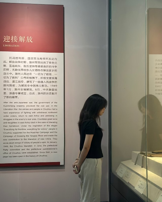 “迎接解放” 篇章,重现解放战争时期的烽火岁月。滁州军民经历奉命北撤、重返皖东、敌后坚持的曲折历程,无数皖东儿女为解放家乡血洒疆场。而滁州人民喊出 “一切为了前线,一切为了胜利”,积极支援淮海战役、渡江战役,用小车与扁担,为革命胜利筑牢后盾。1949年滁州全境解放,崭新历史篇章开启,这份军民同心的热血担当,深深烙印在展区的文字与文物间 。