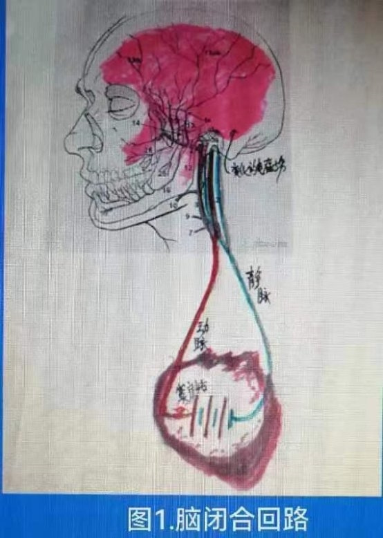 这个“波”称为“量子波”,它来自心脏,即在外界的激励下,窦房结起博产生的电磁波通过心血管到脑血管,变化的电磁波在密布的脑血管周围产生变化的磁场,变化的磁场在神经元中激励出“量子波”,“量子波”带着外界信息和“神经递质”在神经元中运行。脑和心脏形成了一个闭合回路(如图一所示)。