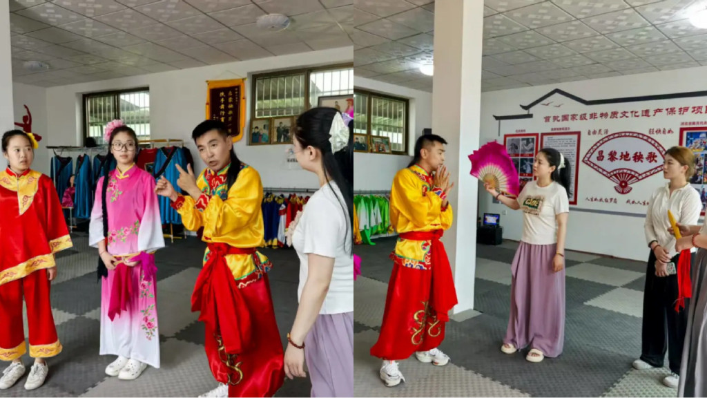 之后,实践队员们兵分多路开展"教学+展演"活动。在少儿艺术机构,队员们用宋老师"过日子的故事"解读角色:把丑角比作"调皮的小伙",妞角当作"害羞的姑娘",擓角化作"爱操心的长辈",用《扑蝴蝶》的情节设计互动游戏。孩子们跟着模仿"开扇扑蝶"的动作,虽稚嫩却认真,课堂上满是欢笑声。镜头里孩子们举着彩扇的模样,配上"非遗里的生活智慧"的文案,在新媒体平台收获广泛关注。
