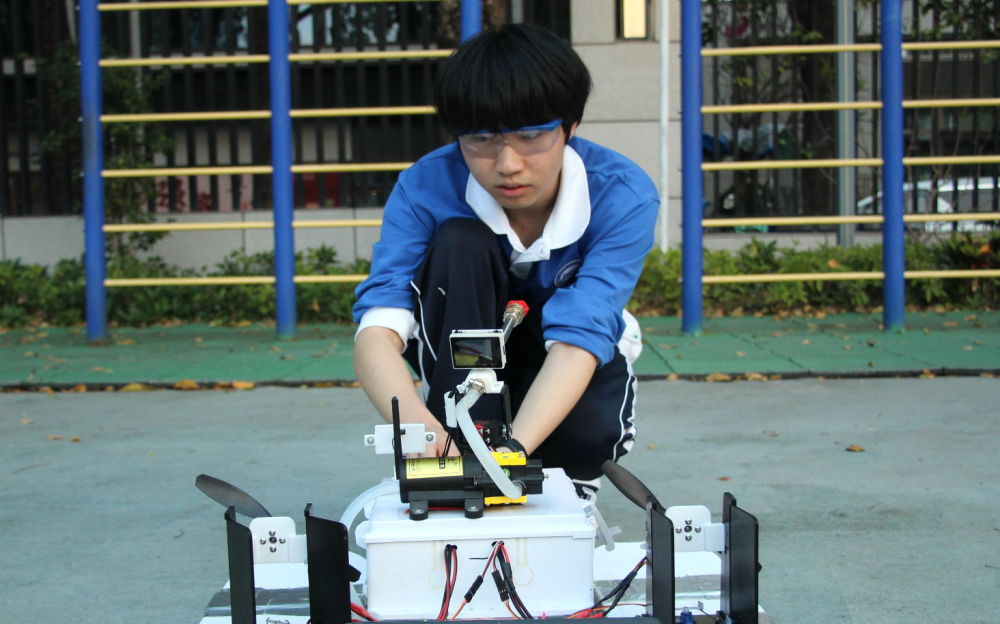 “浪卷红消”团队陈君杰同学在学校操场调试设备