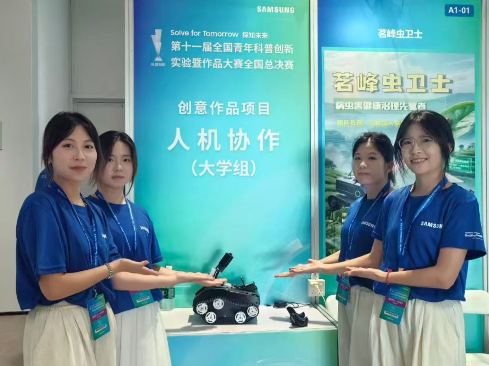 其中,来自贵州师范学院的“茗峰虫卫士”团队立足国家病虫害防治需求,深入挖掘人工智能、激光技术在农业领域的巨大应用潜力。团队队长牟连言介绍,“我们将目光聚焦于丘陵茶场这一特定场景,打造出一套集‘监测-识别-治理-预防’功能于一体化的智能设备”。
