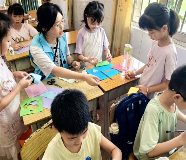 实践队紧扣“百千万工程”促进城乡融合发展的核心目标,将前沿AI教育工具引入乡村课堂。团队为学生量身定制了涵盖红色故事、安全知识、非遗文化等内容的个性化知识模块。通过智能学习系统的精准推送,队员们的生动讲解以及线上优质资源的合理利用,实现AI数字技术为课堂“提效增智”,让优质教育资源突破地域限制惠及乡村学子。与此同时,实践队特别引入云浮衍纸画课程,从卷纸造型技巧到创意构图设计,让孩子们在动手实践中近距离触摸本土文化脉络,感受非遗艺术的独特魅力。这种“数字赋能教育,传统浸润心灵”的双轨教育模式,让支教在传授知识的同时,也为非遗传承在孩子们心中播下希望的种子。