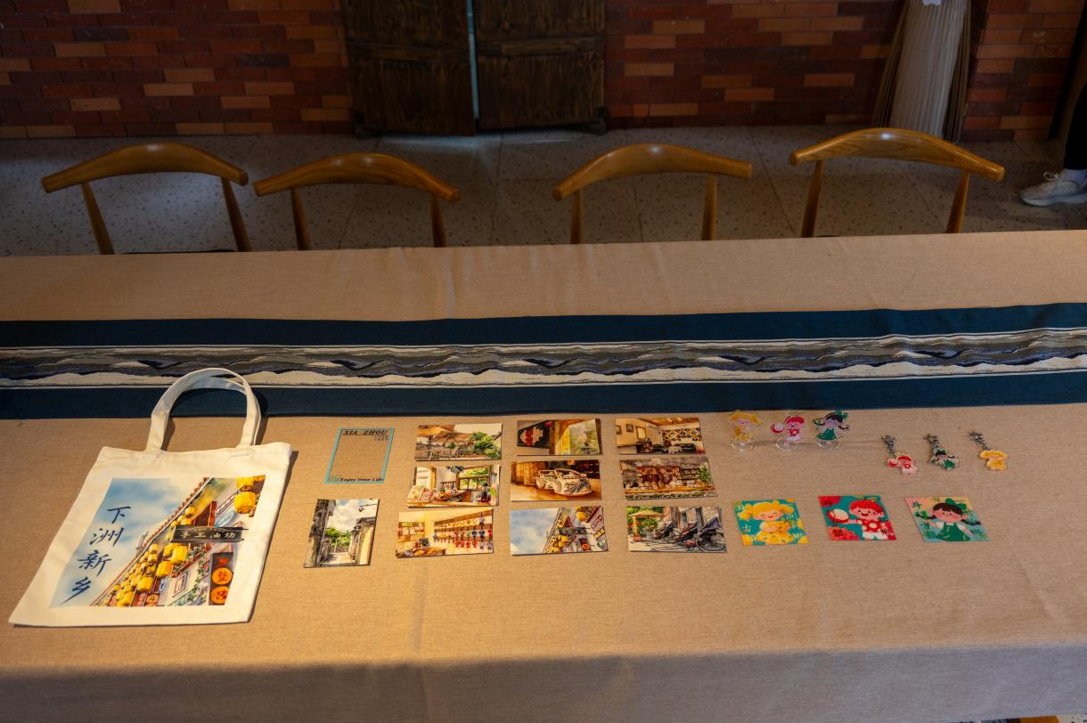 游客服务中心的“穗美工坊”展架,一天之内成了拍照打卡点。“下洲新乡”主题帆布包、PVC透卡、风景明信片,荔枝、黄皮、甘蔗造型的小粒牌、钥匙扣和杯垫……展架旁边附上了小程序二维码,扫码即可直达商城。“没想到在古村还能买到这么潮的文创,荔枝造型的钥匙扣太戳我了!”来自广州的游客李女士一边拍照一边感叹。