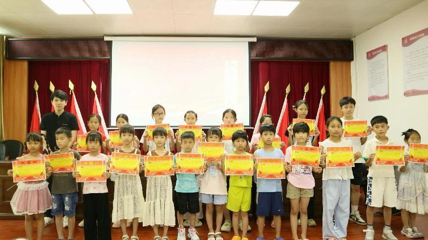 7月17日下午,结营仪式启幕。主持人曾雅诗阐释三下乡意义,欢迎惠州学院外国语学院高若晴老师,感谢其专业指引与陪伴,及良井镇政府、霞角村村委会的支持。