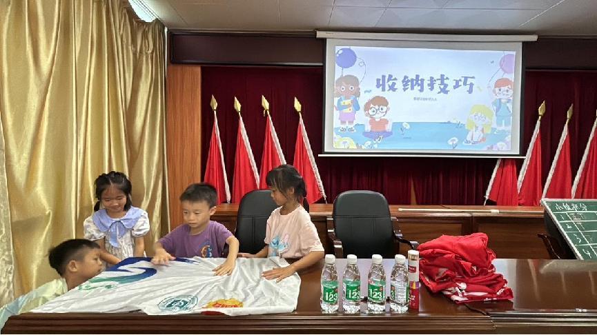 吴宜轩老师的物品整理课上,孩子学叠物品,欢呼藏责任初悟,体现课堂培育自理力。