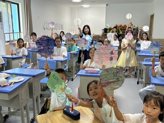 因此支教期间,团队立足实际,设计了特色课程体系。在非遗文化实践课上,10岁的李玲谊双手轻颤着将素白漆扇斜斜浸入水中。随着手腕灵巧地旋转,清澈的水面荡开层层涟漪,扇面上渐渐浮现出独特的水波纹路。阳光透过水面折射在扇面上,那些流动的纹路仿佛带着江南水乡的温柔缱绻。生命教育课则通过植物拓染、绘本共读等方式,引导孩子们理解生命循环。11岁的谢一诺在课后表示:"原来落叶不是结束,它能在世界上留下属于它的痕迹,也会让新芽长得更好。"这样的教学场景每天都在上演。队员们发现,通过将抽象的生命教育与具象的手工实践相结合,孩子们更容易理解生命的循环与价值,也让大家一直回避的话题变得豁然开朗。汉源县少年宫负责人王玉琴观察到:"这些城里来的大学生很懂孩子们的心思,他们设计的课程既有趣又有深度,连平时坐不住的孩子都能专注地完成作品。"