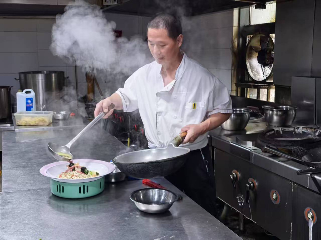图为淮扬菜大厨做大煮干丝装盘的工作。冒袁菲摄