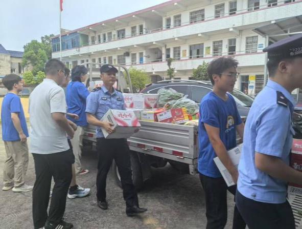 在前期走访中,邓所长了解到志愿实践团希望联合开展法制与安全教育的需求,且在实地考察时发现师生存在生活物资保障缺口。为此,邓所长迅速部署法治主题教育课堂内容;同时,亲自发起全所民警爱心募捐,并多方协调社会爱心力量筹措物资。在法治安全教育活动当日,全所筹措的包含饮用水、防暑降温用品等师生急需物资同步运抵松树桥学校,以实际行动彰显了政府与社会对教育事业的关怀与支持。