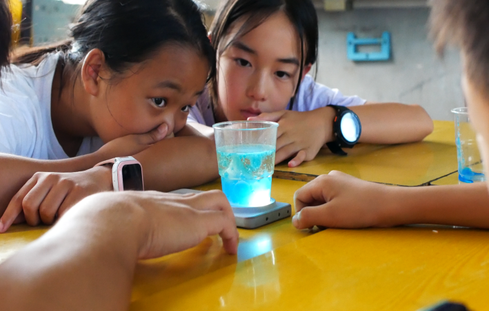 此次支教实践期间,支教团的成员不仅教授语数英等主要课程,还结合专业特色开展了生态环保、体育八段锦、化学实验等创新课程。其中实验课程深受学生们喜爱。通过“流血的‘心’”、小苏打熔岩灯、焰色反应等实验项目,激发了学生对于化学知识的兴趣,在他们的心中埋下了探索创新的种子,让他们感受到了化学的奇妙魅力,在寓教于乐中增长了知识。