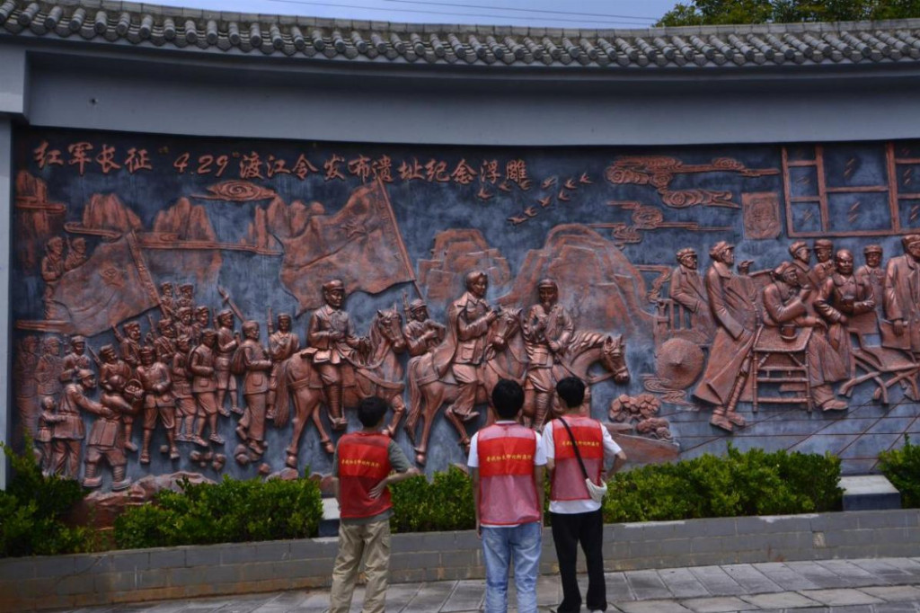 图为团队成员驻足红军长征“4.29”渡江令发布遗址纪念浮雕前参观。李爱萍 供图