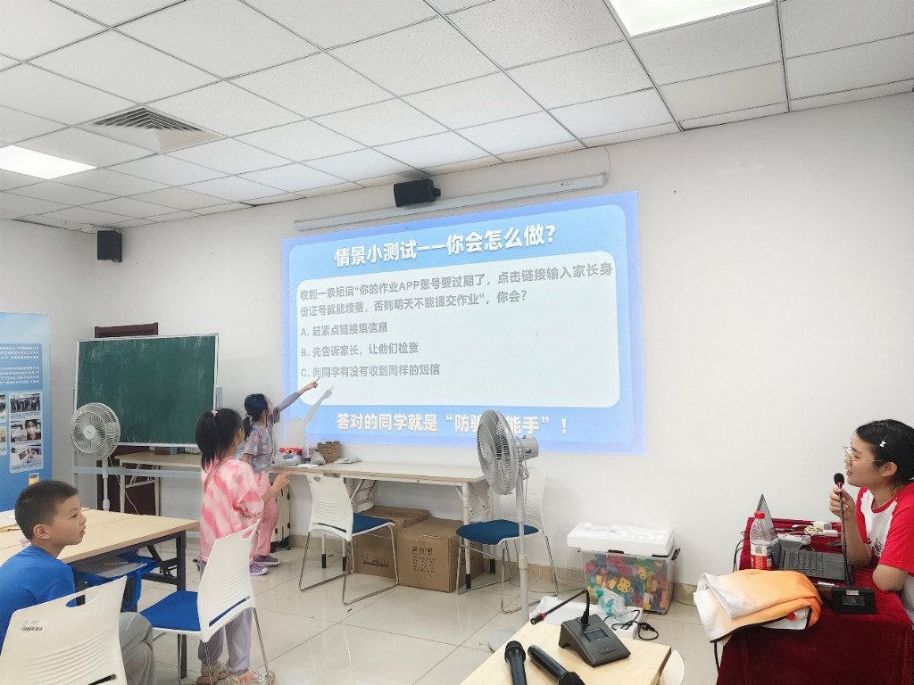 课程采用卡通PPT与互动问答相结合的形式,引导孩子思考“谁能保护你”;在“爸爸妈妈必须让我上学吗”等现实讨论中,让法治观念变得生动可感。课堂还特别设计了报警求助情景模拟,让孩子在角色扮演中学习并掌握实用的法律求助技能。
