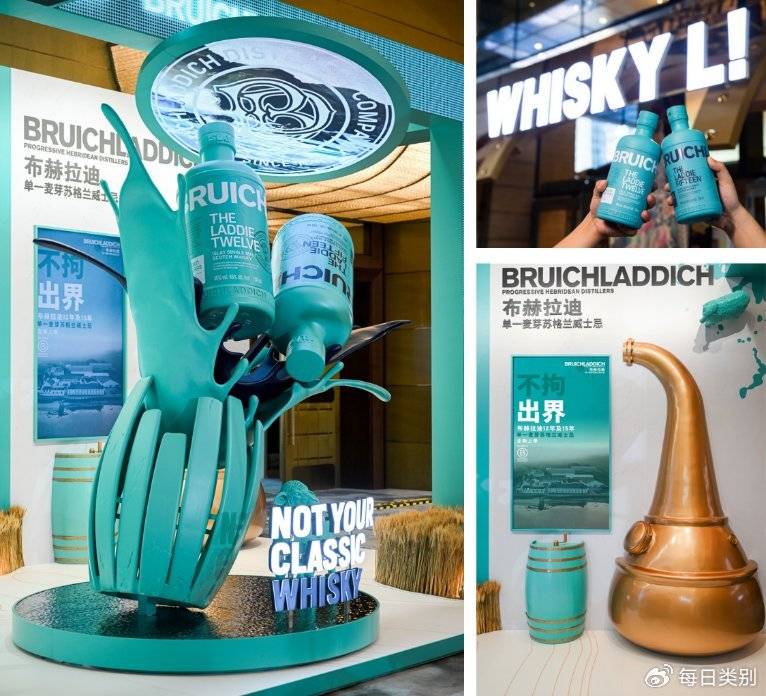 品牌以标志性的布赫拉迪蓝构建了一个迷你版的艾雷岛先锋酒厂,将风土表达与先锋精神大胆呈现。入口处,颠覆威士忌传统范式的创意艺术装置带来视觉冲击,在艾雷岛风土的滋养中,布赫拉迪12年与15年伴随酒液从橡木桶中反重力倾出,麦田、蒸馏器与橡木桶勾勒出风土图景。随着体验深入,来宾可在展示区通过摇动蓝色橡木桶上的摇杆,在互动大屏上模拟佳酿蒸馏的过程,了解酿造精髓。于此一旁,布赫拉迪全系列产品一一陈列,使用不同酿造技艺、经历不等酿造时长、拥有不同风味的佳酿讲述着布赫拉迪作为艾雷岛先锋的不同之处。