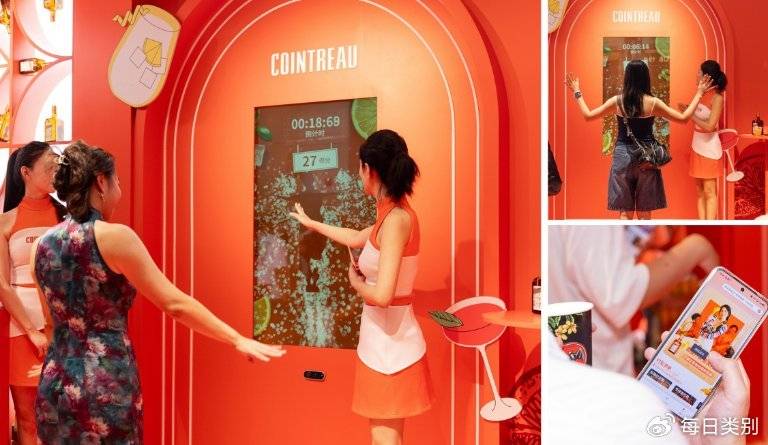 在游戏互动区域,来宾通过大屏交互,即可发起一场30秒节奏挑战:宾客只需站上感应区域,跟随音乐挥动手臂或摇摆肢体,就可将每个动作化为屏幕中的缤纷气泡进行积分排名。扫一扫互动墙旁的二维码,即可进一步解锁君度的调酒配方,摇晃之间轻松体验橙趣局,一杯杯鸡尾酒触手可得。
